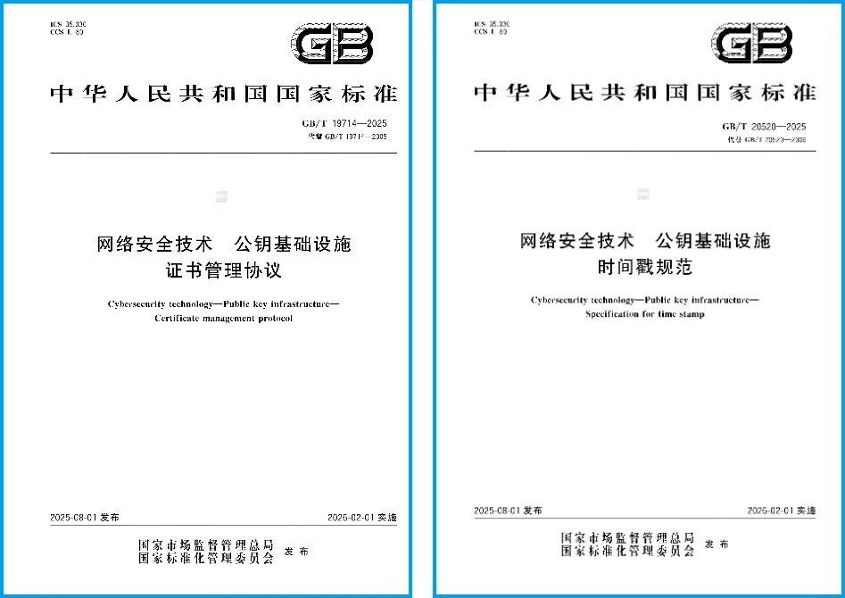 2月1日起,数安时代参与编制的2项网络安全国家标准——GB/T19714-2025《网络安全技术 公钥基础设施 证书管理协议》(以下简称:《证书管理协议》)、GB/T20520-2025《网络安全技术 公钥基础设施 时间戳规范》(以下简称:《时间戳规范》)正式实施,为构建可信网络空间环境提供了坚实的标准支撑。
