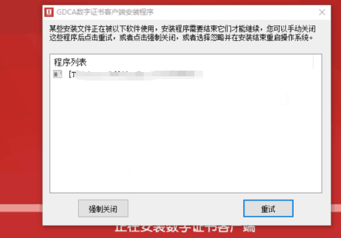 注意:安装客户端时若弹出提示(如下图),请勿点击 “强制关闭”!需先关闭对应进程后再点击 “重试”—— 若强制关闭后重新安装,客户端将无法正常运行。