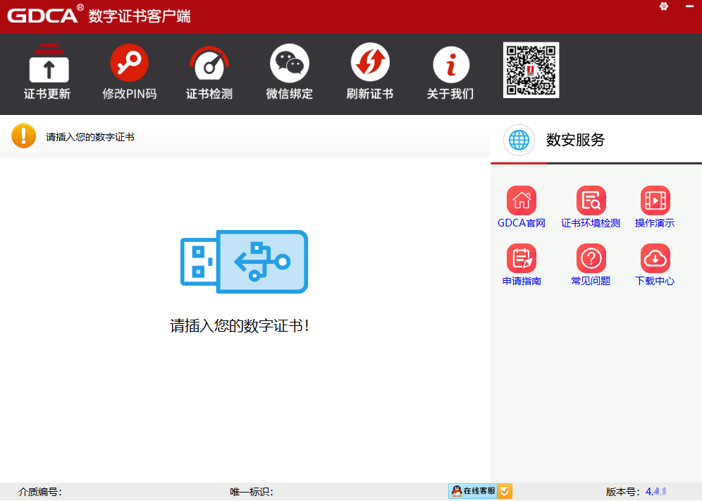 双击桌面【GDCA 数字证书客户端】快捷方式,此时客户端会提示 “请插入您的数字证书”,将 USB-key 插入电脑 USB 接口(建议直接插入主机后置接口,避免使用 USB 集线器)。