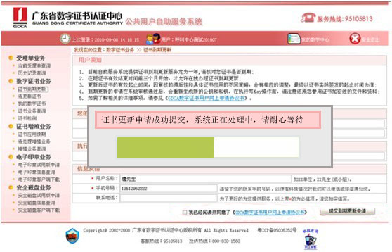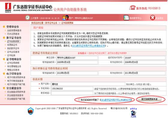 请在申请页面“信息反馈”带“*”号必填选项内准确填写清楚你的姓名及联系方式,再勾选“我已经阅读并同意了《GDCA数字证书用户网上申请协议书》”,点击【提交到期更新申请】按钮,