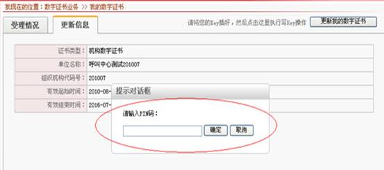 6、数字证书更新申请成功、系统审核后,进度条消失,会自动跳转到证书下载页面(如下图),请在弹出PIN码(证书密码)提示框内输入您的数字证书密码;