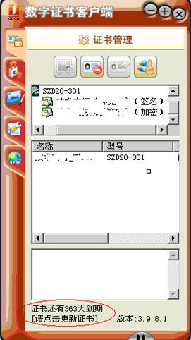 温馨提示:更新完成后,请关闭更新网页、拔出数字证书,再重新再插入,数字证书客户端会重新加载证书,并显示数字证书新的有效期,如下图所示: