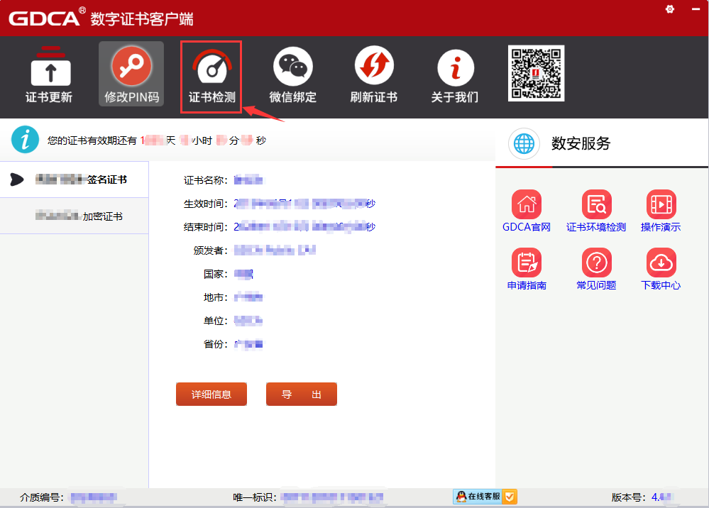 1.打开已安装的 GDCA 数字证书客户端,确认界面已成功读取证书信息(如证书名称、有效期等)后,点击【证书检测】按钮;