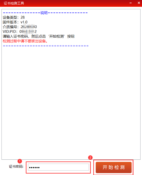 3.输入 PIN 码,点击「开始检测」,检测过程中请勿拔出设备,如图: